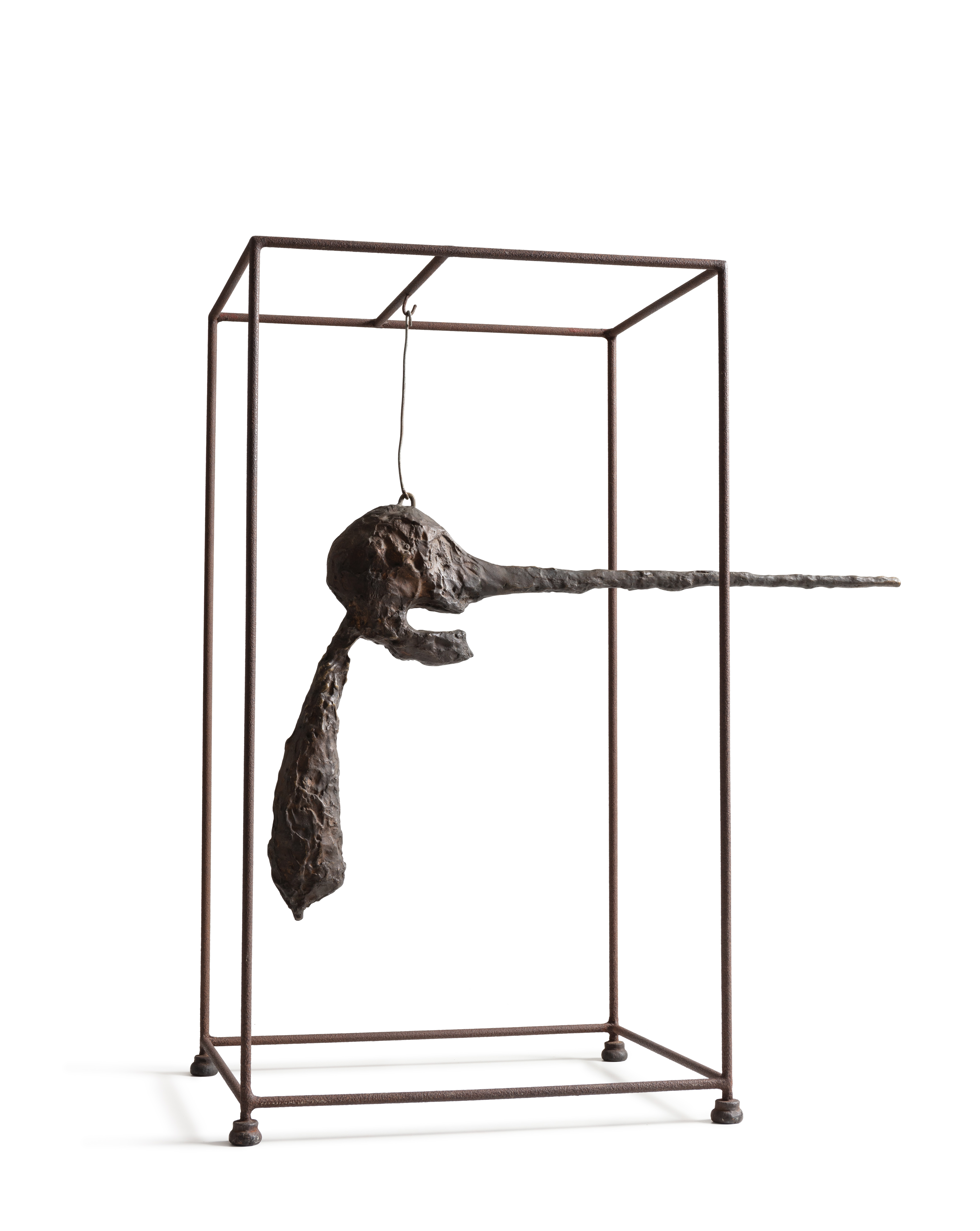 The idea of being finished with a work of art was not one that sat well with Giacometti. He constantly sought to modify and rethink existing works, often revisiting pieces from five or ten years before. The first iteration of Le Nez was created in plaster in 1947. Hand painted by the artist and with a more narwhal-like shape to the nose, this form’s open mouth and red painted tongue create a sculpture more animalistic in feeling. Hung from a metal bar by a rough piece of rope, this version of Le Nez was exhibited at the Pierre Matisse Gallery in New York in 1948—Giacometti’s first exhibition in over a decade. Within a year of that exhibition, Giacometti had made a second version which narrowed the form of the nose and removed the shape of the tongue. This sculpture, also in plaster, was hung in a more finely finished cage. It was not until around 1964 that a plaster cast was made by the artist after this second 1949 version which was, in turn, used to make the bronze edition. The bronzes are suspended in the more refined cage-form but in these the additional feature of rounded feet has been added to the base of each leg. These continued modifications—all of which play with proportion of sculpture to cage, height of the head and assumptions about the viewer’s perception—exhibit Giacometti’s constant refinements of his forms and an ongoing desire to perfect his work.