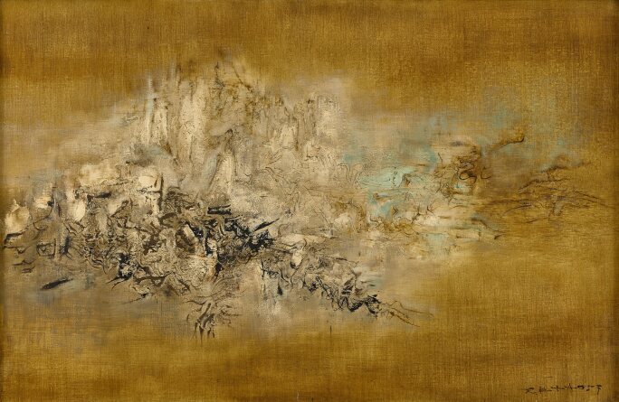 In the 1950s, Paris was a foreign land for China-born Zao. With this outsiders’ perspective, he created Ailleurs (1955), which sold at the Sotheby’s Hong Kong Modern Art Evening Sale in autumn 2016. The piece has a mysterious, profound aura that offers glimpses of Chinese cultural treasures that have been buried deep for thousands of years, while also evoking the mists of Song landscape painting. The oracle bone symbols that appear throughout the simple and deep image seem to fuse the artist’s impressions of his adopted home of Paris with fresh yet remote memories of his hometown. Two years later, Zao painted Mon Pays (1957), a work that takes the abstraction one step further than Ailleurs. Mon Pays is completely devoid of narrative. With a thoughtful yet simple style, he has used textured, heavy colour and uninhibited brushwork to create a work abounding in intense rhythms and unknowable mysteries. In Ailleurs and Mon Pays, Zao Wou-Ki, an artist living far from home, does not stray from his artistic haven. This is a seemingly boundless land, without reference to any particular landform. He condenses the full weight of his emotion into the wavering, misty contours of the landscape.