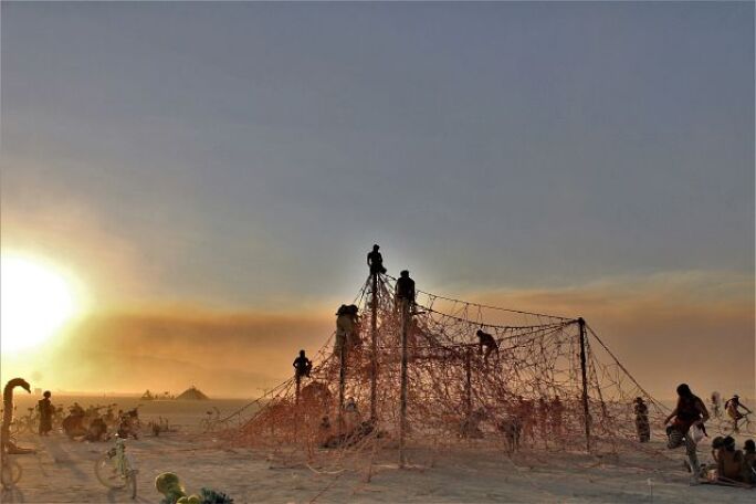 As I gained mastery over the practice of tying itself, I became aware that the environment in which I was tying could serve to intensify the effect the ropes had. I began to shape the space in which I tied. My first intention was rather literal. To create a space where a visitor would feel the effect of being tied by entering it. This was a sort of "Natural High", a more intense version of how one feels after a massage, or yoga class. I experimented in my studio, galleries in Tokyo, and eventually at Burning Man 2017 with my first large-scale artwork "Shibari Sanctuary".