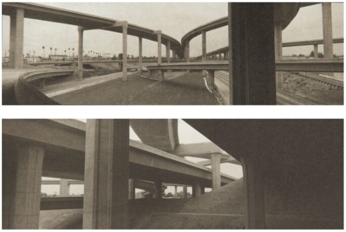 Opie expands the boundaries of documentary photography by pushing her practice in a more conceptual direction through her re-contextualization of the way we view our surroundings, often through her unorthodox vantage points (Opie and Drohojowska-Philp, 37). The unique spatial perspectives inherent to Opie’s work marks another formal continuity throughout her practice. For Wall Street (2001), Opie chose a panoramic horizontal perspective to frame a city recognized for its verticality, while for Freeways (1994-95) she shot from a vantage point below the expressways, thereby elevating the banal roadways to a grand stature.