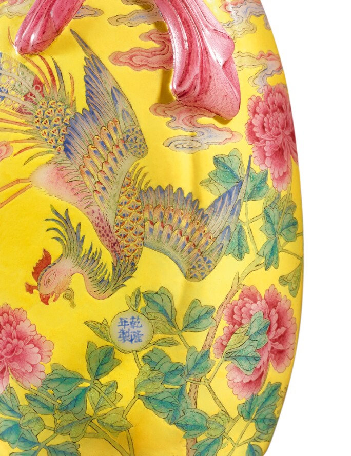 The strikingly conceived and executed design of the present bottle is a pure product of the artistic climate of the ateliers inside the Forbidden City, where artists and artisans proficient in many different media worked side by side and influenced each other. The design is not only ravishingly beautiful, but also highly auspicious, both on account of its shape and its decoration. The term baofu (‘wrapping cloth’) is wordplay on ‘wrapping up good luck.’ Phoenixes and peonies are revered as general harbingers of blessings and prosperity, and rainbow-coloured clouds are particularly lucky omens on account of their rarity.