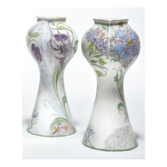 Left: GEORGES JOUVE, TWO "CYLINDRE" VASES, circa 1955. Estimate $3,000–5,000. Right: GEORGES JOUVE, PAIR OF VASES, circa 1950s. Estimate $3,000–5,000.
