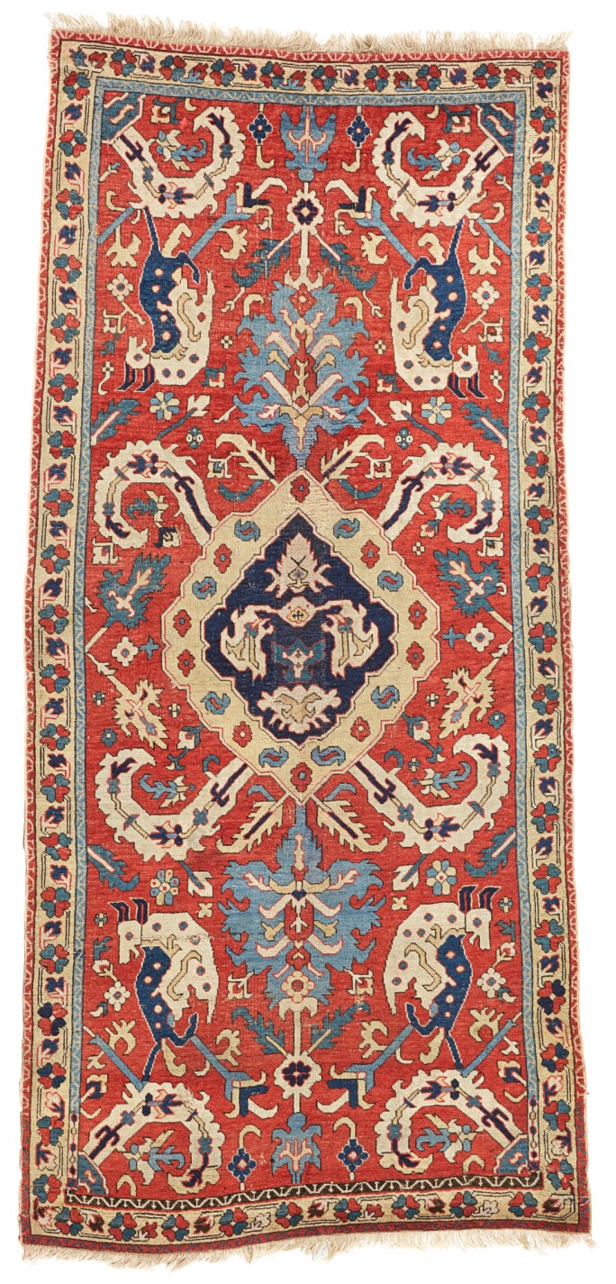 Shah Abbas (r.1587-1629) established weaving workshops in the Shirvan and Karabagh provinces, and early production included large scale ‘Dragon’ and ‘Blossom’ carpets. Classical Persian and Ottoman courtly weavings, both carpets and textiles, provided the design inspiration, which is particularly clear in both the 17th century Animal-Combat carpet in the sale and the late 18th/early 19th South Caucasian rug with the Cheleberd medallion and the Azerbaijan gallery carpet, which reveal how fertile these aesthetic exchanges were in the region.