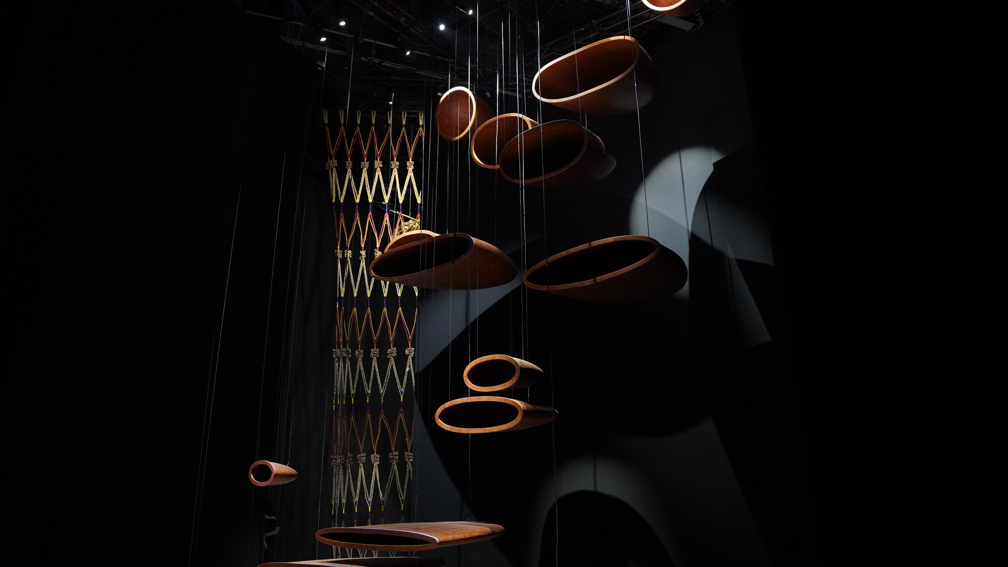So, for instance, we encounter contemporary commissions that respond to elements of Islam, such as Joe Namy’s installation inspired by the adhan (call to prayer), that opens the show. Or, we find ourselves exploring the sense of memory and connectedness found in Bangladeshi artist Kamruzzaman Shadhin’s knotted The River Remembers (2023). Further into the exhibition and we encounter the simplicity in designating a space set apart from the ordinary world with a simple border made of rocks, in the The Last Tashahud by Moath Alofi, developed with Sumayya Vally, one of the four curators of the exhibition.