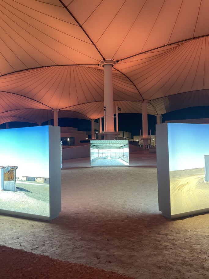 It’s an intriguing proposition: What exactly constitutes an Islamic Arts Biennale? Saudi Arabia’s first biennale, the 2021 Contemporary Art Biennale at the JAX District in Diriyah, was a straightforward proposition: contemporary art works, global purview, stated curatorial thesis. But an Islamic arts biennale? Beyond ‘Islamic art’ being itself a fluid category, the idea of explicitly foregrounding religious themes within the secular context of contemporary art isn’t straightforward. Like listening to a story told by music – the Biennale’s venue brings you through the darkness of the new, purpose-built galleries for both contemporary commissions and Islamic artefacts, into expansive light, drawing you in, under the billowing tents of an airport terminal specifically built for Hajj pilgrims. One had to blink a moment to forget the beauty and think about the implications and wider context of the show.