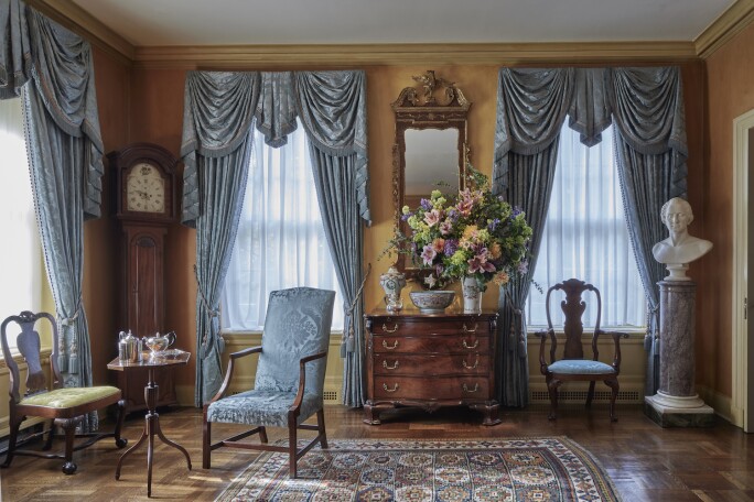 Erving and Joyce Wolf also gathered furniture by the finest makers of their time, including the Gibbs Family Chippendale Block-and-Shell Carved Mahogany Kneehole Bureau Table, circa 1770. Expertly carved in Newport, Rhode Island, it is one of the very best examples of its form. Descended through five generations of the Gibbs family, the piece has only ever been offered at auction once before, when it was last sold at Sotheby’s 40 years ago.