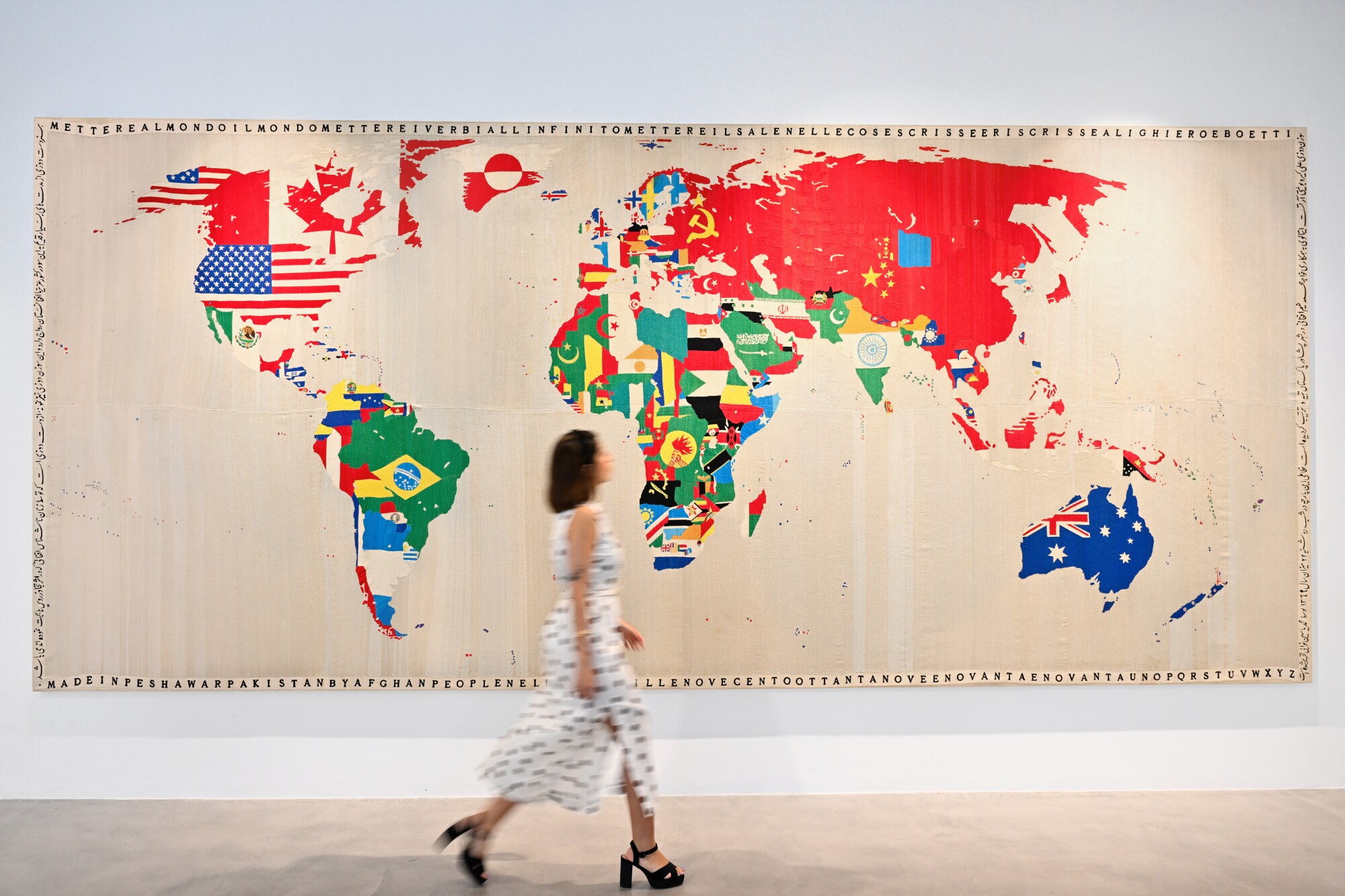 Francesco Carraro’s lifelong connoisseurship and celebration of international artistry paralleled Boetti’s ceaseless pursuit of dialogue with other cultures, of which Mappa is an exceptional example. Boetti was deeply inspired by non-Western art and culture, travelling to Africa, South America, East and Central Asia as well as, most significantly, Afghanistan and Pakistan. In 1971, during his second trip to Afghanistan, Boetti conceived of his first large-scale Mappa when he worked with dozens of skilled Afghan women from a local embroidery school to stitch flag designs onto each corresponding country. Aside from the flags, Boetti encouraged the artisans to decide on the color of the seas in each Mappa, a conceptual decision intended to inweave the creative spirit of others into each finished product while allowing the intrusion of chance in their design.
