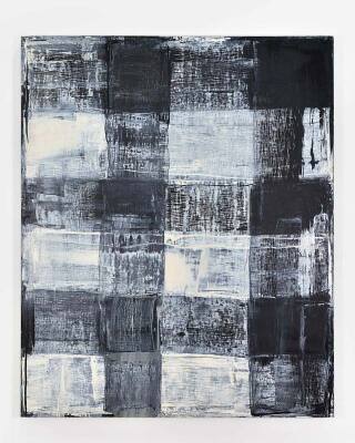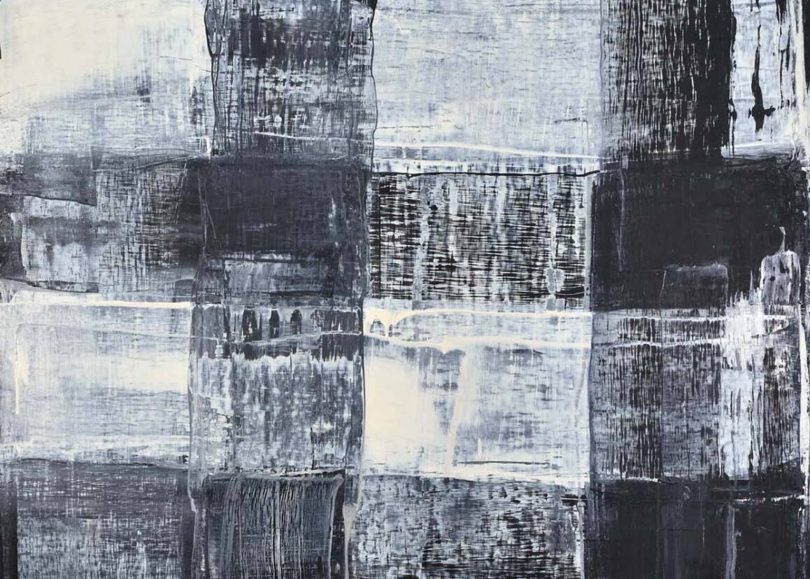 Employing a black and white palette, Feinstein made relief prints out of linen pieces. She attached square images of the weave patterns onto a canvas, creating a four-quadrant grid. Feinstein was intent on making the work as simple and non-gestural as possible.