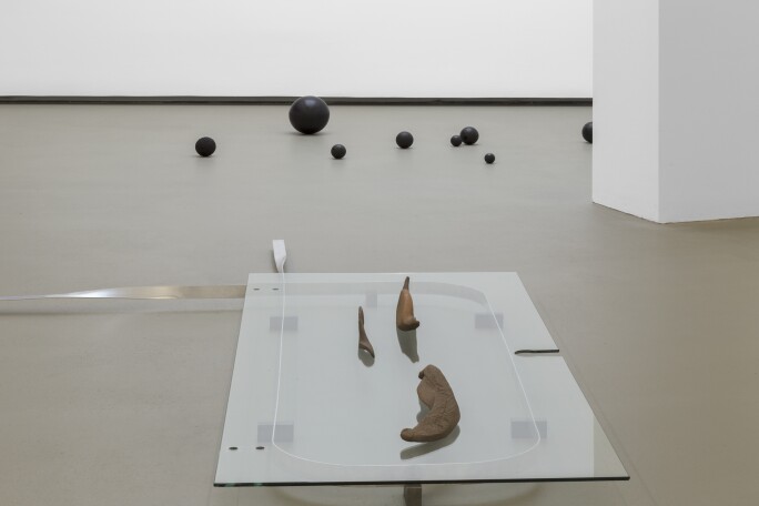Artforum once described her process for creating another sculpture, titled Aal und Aal (Eel and Eel) – which looks like a group of clay creatures stuck mid-slither atop a glass door – as: “gripping raw clay and repeatedly swinging it downward like a meat cleaver.”