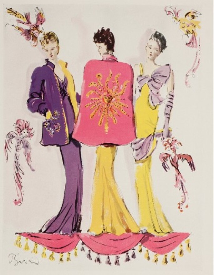 Cocteau also worked with the Maison: his line drawings were transposed into cascades of golden embroidery for the autumn 1937 collection. Van Dongen and Dufy transformed Schiaparelli’s daydreams into fashion illustrations, while Vertès and Peynet projected them into captivating advertisements for her perfumes.