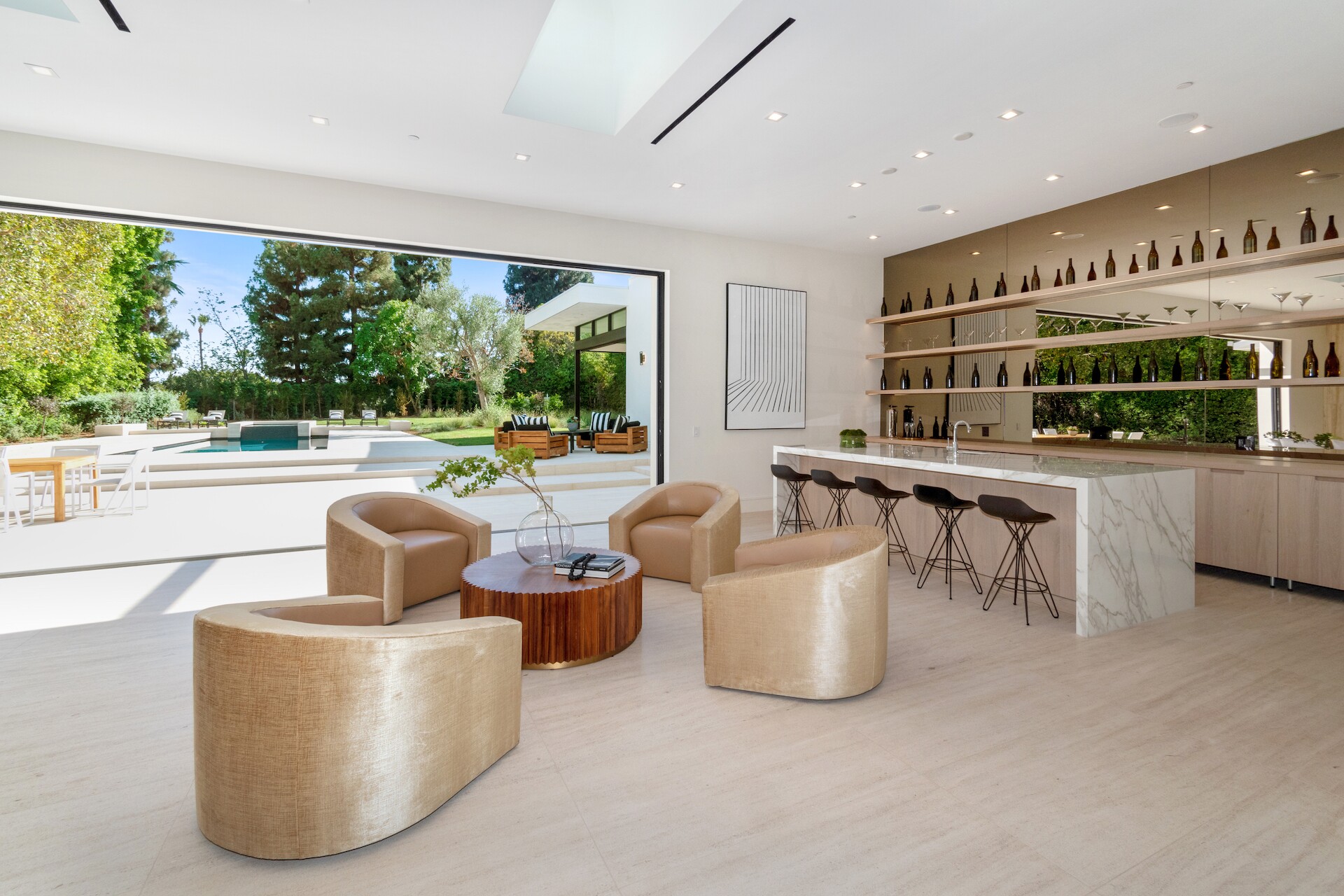 Luxury and tranquility meet in this captivating reimagined single-story four-bedroom sanctuary, situated behind private gates in Beverly Hills. Indoor-outdoor harmony is meticulously defined by the open floor plan leading to a spacious pool and garden grounds. An artfully placed open-air glass atrium showcases a Japanese maple tree and oversized solid oak front door offering breathtaking kerb appeal. The massive great room features Italian limestone flooring as well as high ceilings, both bathed in natural light from multiple skylights, and the bar area seats five.