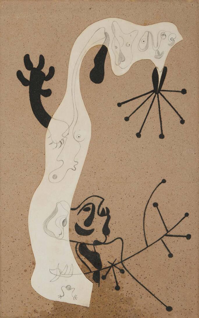 Miró’s Surrealist “art of concept” was deeply rooted in figuration, which he saw as a vehicle through which to express both his Catalan identity as well as his position within multiple European avant-gardes. 1934’s Collage-peinture underscores the artist’s invention of a new kind of pictorial space, one in which Surrealist dreamscapes are infused with figurative forms to dismantle traditional canons of representation. His limited palette brings depth and intensity to the present work, as the viewer’s eye rhythmically traces shapes and finds points of tension where oil and collage meet the sandpaper base. Though his vibrant palette is today one of Miró's most celebrated artistic attributes, the muted tones of Collage-peinture offered the artist the opportunity to focus more closely on forms themselves, and by extension, his own sensory relationship with his materials.