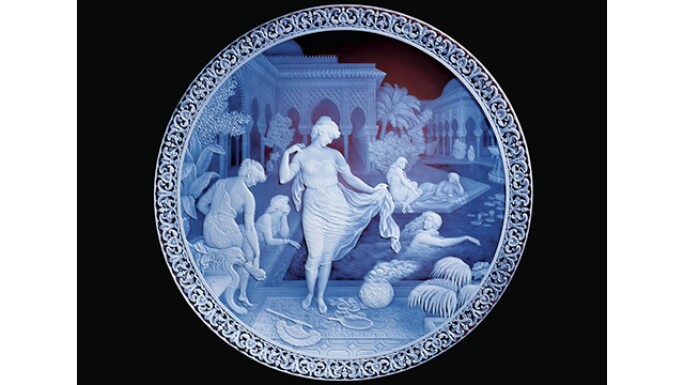 At the turn of the century and at the height of the Industrial Revolution, economic stability grew in Europe and so did the middle class. Glass makers were able to take advantage of the boom by using steam to power cutting wheels. This process reduced costs and made production more efficient. This period is best represented by objects from the British Arts and Crafts Movement, in which designers and artisans emphasized aesthetics over functionality and started creating delicate, fantastical and elaborate products such as this Thomas Webb and Sons' plate - Moorish Bathers - from the late 19th century.