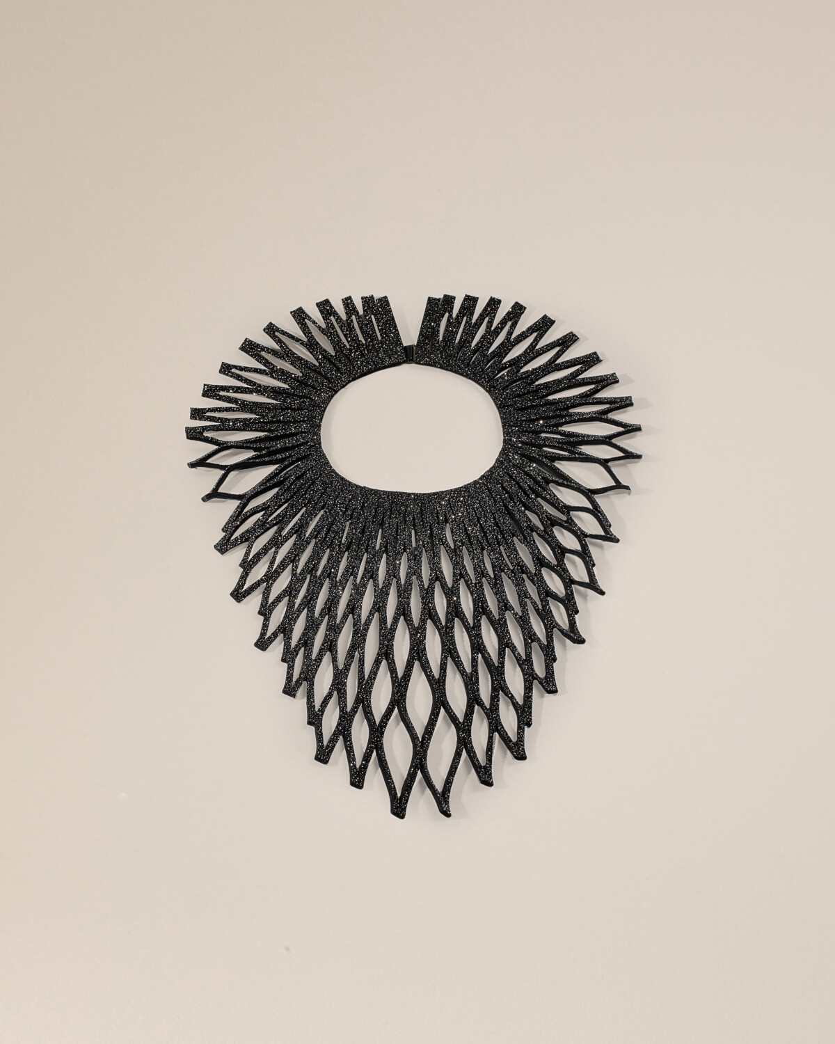 Yes, it’s all those things at once! But when I was starting out, it was unsettling, because it’s easier when things fit one category, and you can label something clearly. But then, as I kept pushing in this direction I realised that you could see and experience all those aspects within this piece of jewellery from numerous perspectives. So, this necklace evolved from the very first necklace I made, called ‘Dido’. Here, I wanted to make something with the same impact but slightly easier, so it doesn’t go all around your shoulders and back, but just creates this very airy, movable effect as it drapes your body.