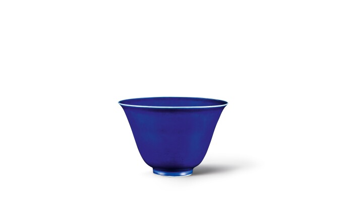 Dating to the Jiajing (1522–1566) period of the Ming dynasty, this truly exceptional bell-shaped cup is a sublime creation, perfect in form and applied with the richest of cobalt-blue glazes. Originally in the collection of Paul and Helen Bernat, it was later acquired by Professor E T “Teddy” Hall, the renowned scientist famous for carbon-dating the Turin shroud. When it was acquired from his collection at Sotheby’s Hong Kong in 2000, it fetched an unprecedented price for a monochrome of this period. The term “sacrificial-blue” is used for porcelains of this pure blue colour created for the Altar of Heaven in Beijing. —JK