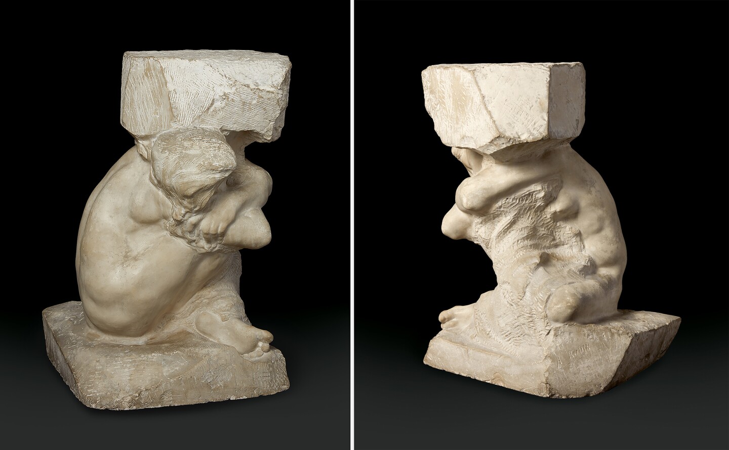 Six months later, the work was complete. Standing at 25 inches, Cariatide tombée portant sa pierre is materially rare within Rodin's oeuvre. Only two other examples of the work in stone are known to exist: the location of the first is unknown, and the second is in the collection of the Musée Royaux des Beaux-Arts-Brussels.