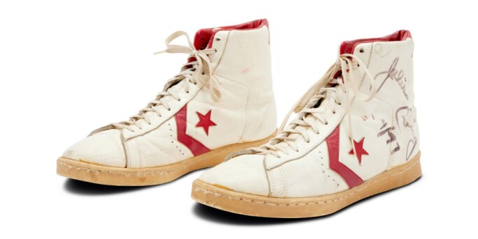 This pair of Converse Pro Leather sneakers was worn by Hall of Famer Julius “Dr. J.” Erving, who changed the game forever by bringing the field of play “above the rim.” Erving won three championships and four MVP awards and was named as one of the NBA’s 50 Greatest Players in 1996.