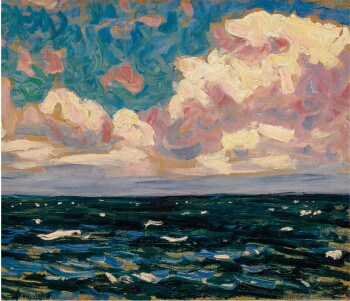 August Strindberg, 1894August Strindberg, the celebrated Swedish painter, playwright, alchemist and poet, visited Dornach, Austria in 1894, where he painted a series of emotionally charged, semi-abstracted landscapes. This work, which depicts the Danube dramatically flooding its banks, draws upon Strindberg’s scientific theory of “monism” by depicting sky, water and land as blended into one with animated bursts of color.