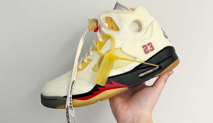 A follow-up to the black Off White Air Jordan 5, this 2020 Air Jordan Off White release, in the “Sail” colorway, nails Abloh’s vintage aesthetic. The Off White Jordans are dressed in a cream layered textile mesh upper, with circular window inserts at the midfoot, collar and tongue. The iconic Air Jordan 5 shark tooth detailing, in red, stands out against a black and pre-yellowed translucent midsole, adding to the shoes’ retro look. Off White, Nike Air, Jumpman and “23” branding complete the look.