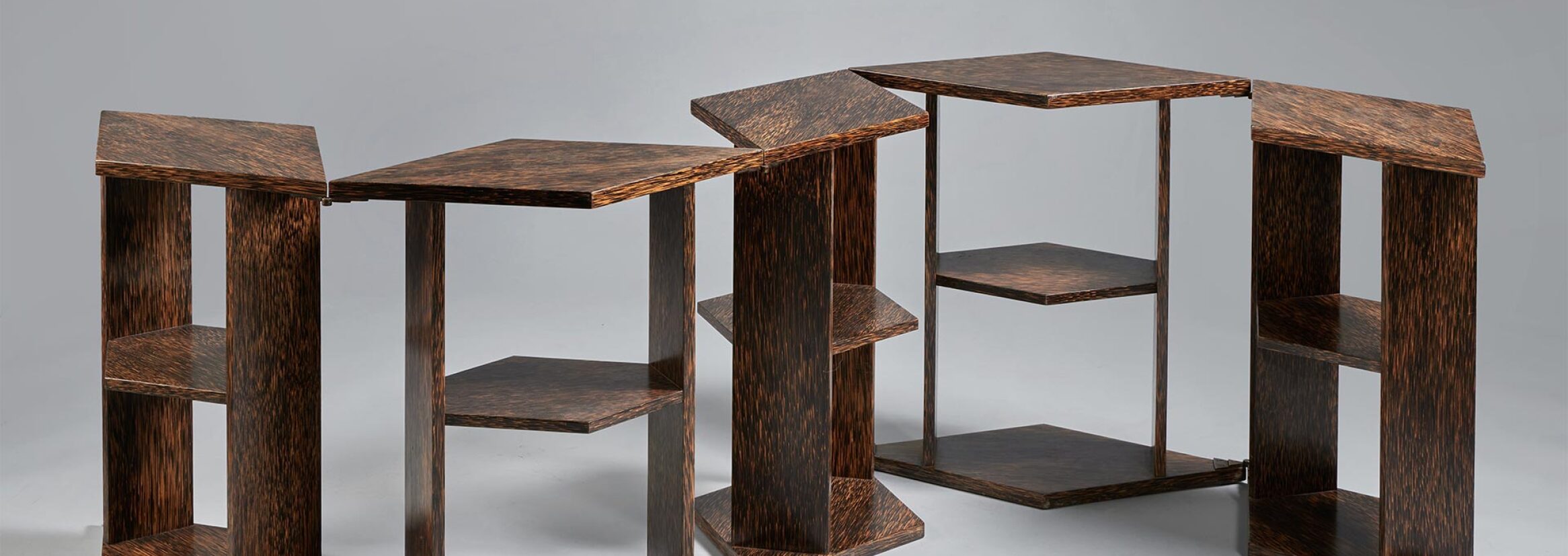 Two of Gray’s Rue Bonaparte designs are present, including a unique table that for some half a century witnessed the comings and goings of artists and friends who rested their champagne flutes on its Japanese-fashioned red-and-black lacquered top. Other highlights include Eugène Printz’s ornate sideboard punctuated by an extraordinary union of ebony parquetry and copper, while Printz’s Table-Bibliothèque is configured like a giant palmwood puzzle. And two 1920s minimalist stools and a table by Pierre Legrain – masterpieces inspired by the artistic traditions of East Asia and Africa – once appointed the villa of Jeanne Tachard, a patron who, as one critic put it, “arrived in Paris around 1900 with nothing but her golden hands and a very secure sense of taste.”