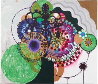 Born in Rio de Janeiro in 1960, Beatriz Milhazes initially studied Communications at the Faculdades Integradas Hélio Alonso University in her home city, before studying art at the Escola de Artes Visuais do Parque Lage. Milhazes developed a personal style that reflects the achievements of both European and Brazilian modernist art (she has cited Henri Matisse, Piet Modrian and Tarsila do Amaral as among her principal inspirations) through bold color schemes and advanced geometric abstraction.