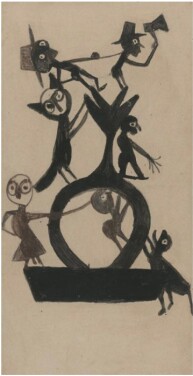 William Traylor was born in April 1853 to slaves on a cotton plantation in Benton, Alabama. By 1909, Traylor was sharecropping in Montgomery County and by 1928, he had left for the capital city of Montgomery. In 1939, camped out on Monroe Street after illness prevented him from continuing his work at a shoe factory, he began drawing and painting. That same year, a friendship developed with Charles Shannon, a twenty-five-year old white painter who was intrigued with the rapid progression of Traylor's untrained craft. Shannon supplied Traylor with poster paints, brushes and paper. In early 1940, Shannon's cultural center New South launched the exhibition Bill Traylor: People's Artist, and two years later, Traylor made his New York debut with a solo show at the Ethical Culture Fieldston School curated by MoMA's director of education. None of the pieces in these exhibitions sold, and Traylor's work did not catch the attention of the broader art world until long after his death on October 23, 1949. In 1982, his work figured prominently in the Corcoran's landmark exhibition Black Folk Art in America, and in 1996 – signaling Traylor's growing relevance beyond the ranks of folk and “Outsider” art – MoMA included his work in A Century of American Drawing. The largest retrospective of Traylor's work to date, Between Worlds, was mounted at the Smithsonian Museum of American Art in 2018.