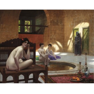 Gérôme’s 1861 Salon submission Phryne before the Tribunal ended his relationship with his master: Gleyre had been working on his own painting of the same title when Gérôme pipped him to the post with his own version and presented it to the Salon before Gleyre had even finished his work. Age of Augustus (1855) demarcates Gérôme’s venture into grande peinture. Poor critical reception, however, forced Gérôme to make an about-turn in 1857, and he returned to principally orientalist and historical easel painting. Throughout the 1860s, Gérôme’s comrades continued to depict antiquity with sensuality and frivolity whilst his oeuvre underwent an evolution: his ethnographic paintings became more profound whilst his ancient scenes grew increasingly serious. Gérôme visited the Middle East between 1854 and 1872, Constantinople and Cairo being his preferred locations due to the magnificent architecture and intriguing human subjects. These trips inspired many works which are considered among the finest in the Orientalist genre. From 1878 until his death, Gérôme also produced many sculptures; these works were largely historical and traditional yet still in many ways innovative.