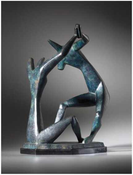 Archipenko's Large Dance, also known as Dancers, boldly explores the relationship between form and space. The artist conceived a smaller version of this figural group in 1912 and exhibited the plaster cast in 1914 at Der Sturm, Herwath Walden's gallery in Berlin. According to Frances Archipenko Gray, the artist made three plasters of this sculpture which were used to cast the bronze editions. These consisted of one small plaster, one large plaster with a smooth surface, which is now in the Saarland Museum in Saarbrüken, and a large plaster with a rough surface. This large, rough-surfaced plaster, which was most likely destroyed during the casting process, was used to create three lifetime bronzes, including the present sculpture.