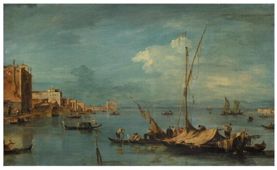 Although a number of these early works are monogrammed or signed – as is the case with the present painting’s pendant – the scarcity of dated works has led to much scholarly debate over the paintings’ precise chronology.6 Goering believed the earliest of them was painted in about 1745, while Morassi suggested the years 1745-50. In 1951 James Byam Shaw expressed the view that Guardi did not start painting views until after 1755, a view supported by Sir Denis Mahon’s observation that one of the Buccleuch pictures shows the onion-capped campanile of S. Bartolommeo di Rialto which was only completed on 1st April 1754. Michael Levey agreed, and Dario Succi more recently concurred with this later dating, suggesting they may even post-date 1758. Whatever their precise date of execution, these vedute capture the essence of the lagoon area surrounding Venice; their poetic atmosphere giving way to the nervous energy of Guardi’s later works.
