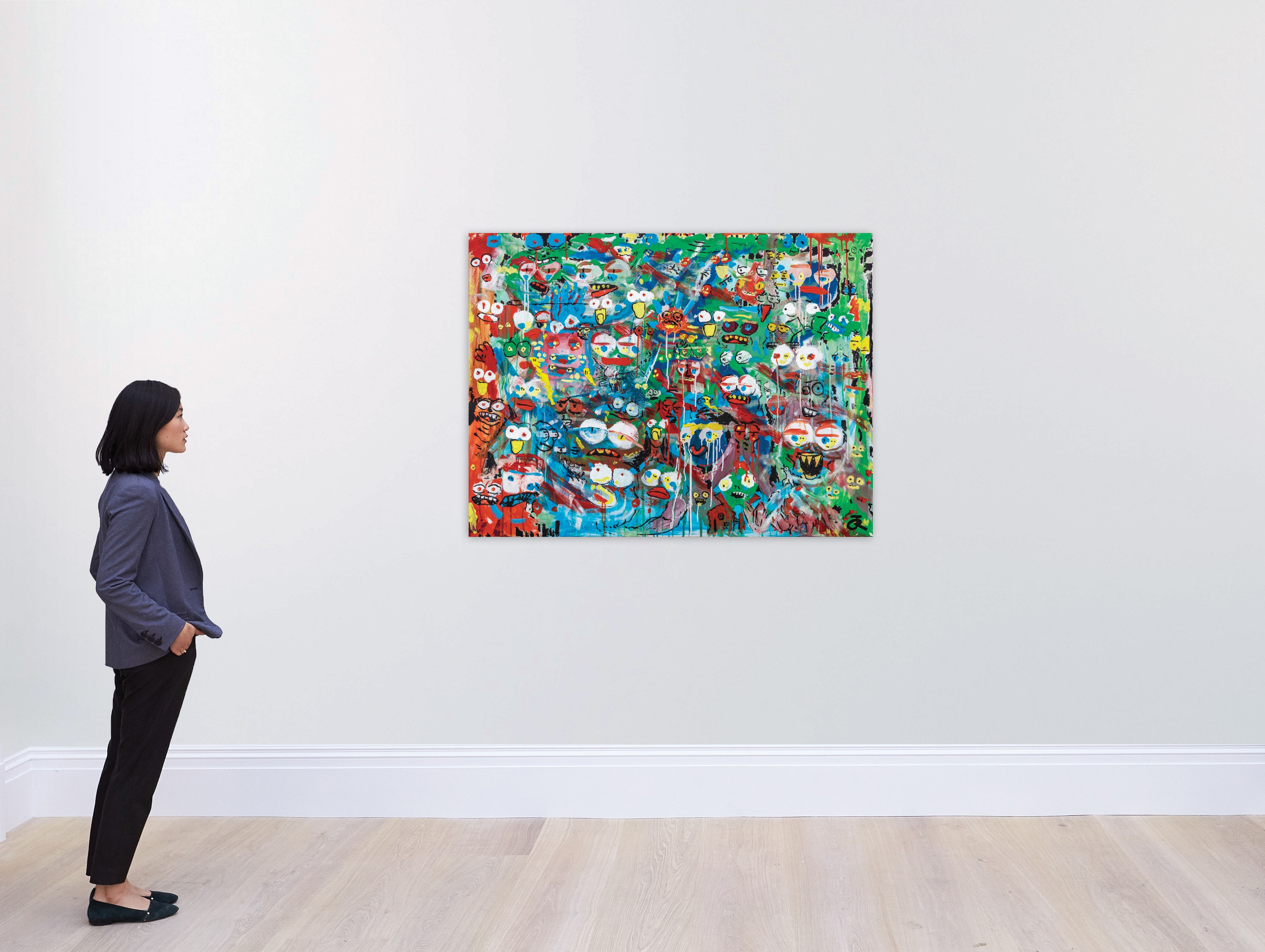 Justin Roiland is the co-creator of Adult Swim’s Rick & Morty and Hulu’s Solar Opposites. He is also the founder and CEO of Squanch Games. Following his highly successful NFT collection, The Best I Could Do, which sold for over $1 million, Justin Roiland is branching out into painting. His new work, mypeoplefriend, executed in 2021, embraces Roiland’s signature cartoon imagery that is humorous and childish, but tinged with darker undertones. His all-over figurative style even recalls some of Jean Dubuffet’s boisterous compositions from the 1960s. In mypeoplefriend, Roiland fills the canvas to the brim as a horde of grotesque figures with bulging eyes and bared fangs press up against its surface. As his title suggests, Roiland compresses visual information, blurting it out in a single word. In this way, his composition becomes a kind of dream world, where there is no respect for visual or spatial logic. Instead, there is only a feeling, or rather, a progression of feeling. At first, his figures seem menacing as they lunge out at us, but none of these childish monsters truly frightens us, and as we continue to scan the composition, we notice that most of Roiland’s figures actually display a certain melancholy as if on the verge of tears. Some figures even seem to cry as the paint drips down the canvas. There is something tragic about these creatures that try to frighten us but cannot. Or perhaps there is something tragic about our position as viewers, so far removed from the innocence of childhood, when these creatures might have frightened us.