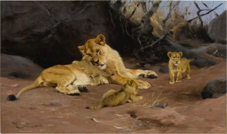 We are honored to offer a group of works from the collection of Bertram and Diana Firestone, whose names have been synonymous with the sport of horse racing for well over half a century. Their collection of works by Sir Alfred Munnings reflects their passion for thoroughbreds, from the pre-race calm of Five Racehorses with Jockeys Up to the thrill of the chase as depicted in A Huntsman Taking A Ditch. From domestic delights to the thrill of the wild, the sale also includes 6 works by Wilhelm Kuhnert and David Shepard that explore the Big Five of the African savannahs from elephants at play to a lioness and her cubs and cheetahs after a successful chase.