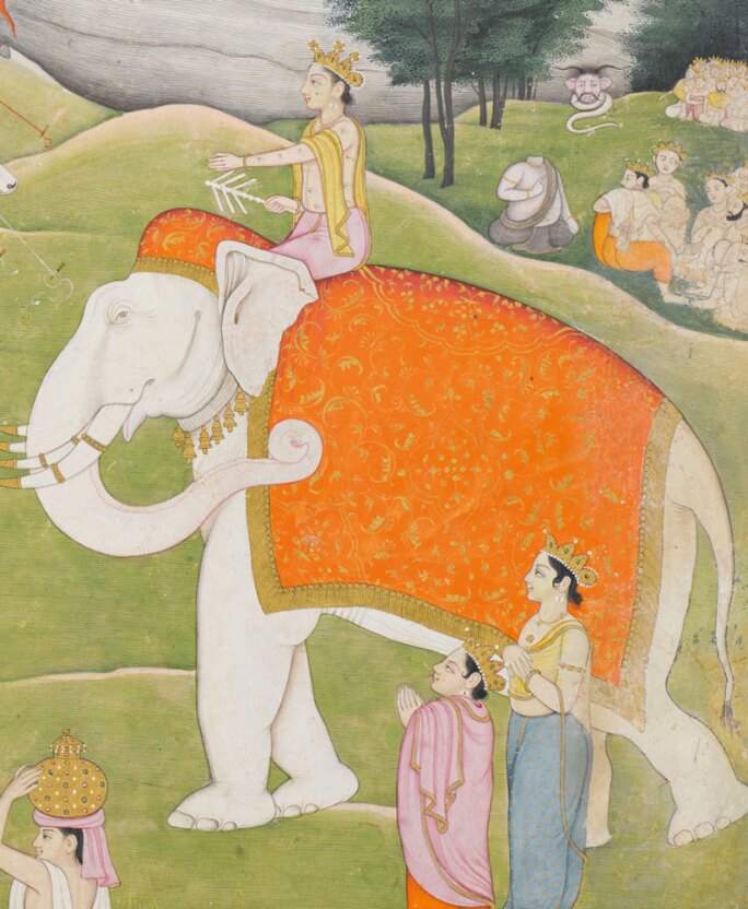 Indra, the king of the gods, is seated on the four-tusked elephant, Airavata. Indra is distinguishable by the thousand eyes marking his body.