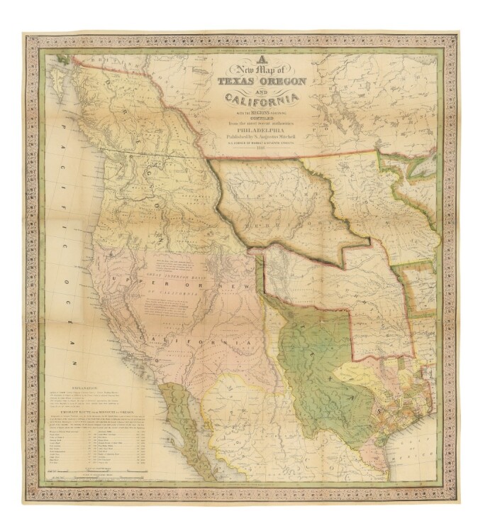 Philadelphia: Published by S. Augustus Mitchell, 1846. A landmark western map and one of Mitchell's most popular and important pocket maps, representing "a great step forward, in that it is among the first by a commercial cartographer to utilize the recent explorations that had bounded and determined the nature of the Great Basin. … Because of its popularity, this map of the West exerted great influence, not only with the public but on other commercial cartographers" (Wheat).