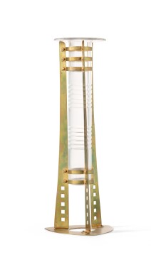 Drawn by René Dulong for his personal flat, this vase perfectly reflects a rational, constructivist and modern creation. Designed in two parts: cut crystal vase and brass support, its elegance lies in its silhouette. Architectural and slender, its decorative elements are arranged with accuracy and exactness. Harmonious in its design, there are, for example, five brass circles and five square cut-outs on each buttress. Its great beauty also lies in the rhythm of the decorative elements. The red copper rivets contrast with the structure while highlighting the quality of the vase's manufacture.