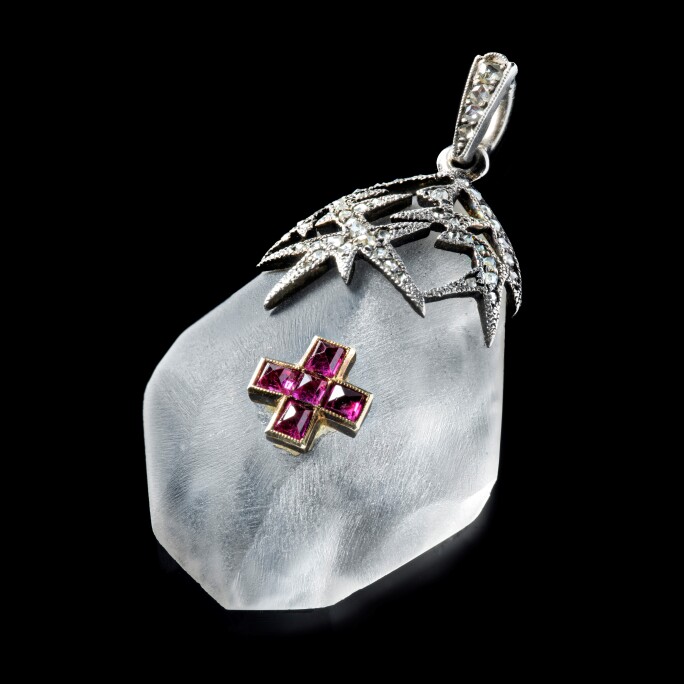 An important Fabergé jewelled platinum and rock crystal ‘Ice’ Red Cross pendant, workmaster Albert Holmström, after the design by Alma Pihl, St Petersburg, circa 1915