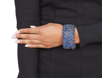 Duquette’s jewelry is distinguished by his bold use of color and volume. Collier-style necklaces designed as mosaics of richly colored stones like lot 301, made of rich blue sapphire beads accented with diamonds, make a bold statement. His pieces require (or inspire) confidence and style in the wearer. Hutton Wilkson, who was Tony Duquette’s business partner and design collaborator for thirty years, sums up Duquette’s philosophy: “If it’s not fabulous, it’s meaningless.”
