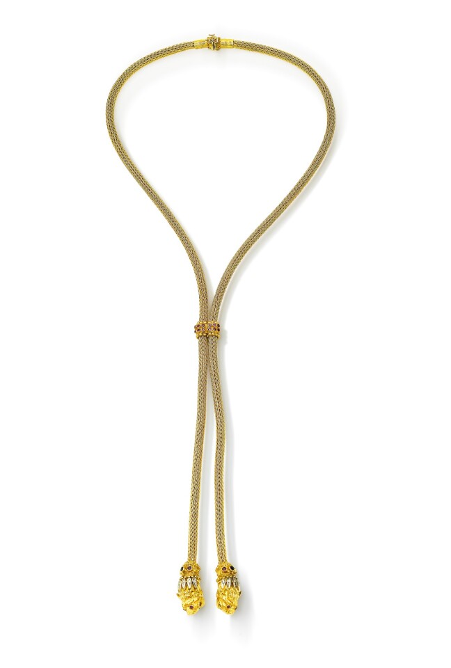 Set with silver and gold beads, the centre decorated with two lion heads, length approximately 395mm, signed Zolotas, French import assay marks for 18 carat gold and silver, gross weight 83.56 grams, pouch stamped Zolotas. -
