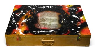 This imposing installation piece, created by DJ Ross One, consists of 32 vintage boomboxes from the early 1980s-early 1990s, displayed together on a custom built shelf and wired to function as a singular sound system. The work includes some of the rarest and most recognizable vintage boomboxes of all time.