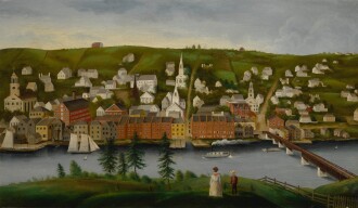 The diverse selection of folk art on offer this year is notable for its variety of weathervanes, portraits, and nautical paintings. Within this selection are two rare early landscape paintings of rural western Virginia. The first showcases the the Blue Ridge Mountains--Sandy Hook, Virginia and the scenic "Seven Bends" (now state park) of the Shenandoah River. The second, depicting the New River near Salem, Virginia, capturing the William Snidow Farm. The sale also includes a lovely pair of portraits by the celebrated folk artist Sheldon Peck.