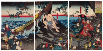 Utagawa Kuniyoshi (1798-1861) renders this legendary and literary episode with his distinctive penchant for drama and action. Extensively printed with Prussian blue, the triptych is lavishly dusted with mica powder, shimmering as it catches the light. The frightening scene recounts a tale famously dramatized in the Noh play, Benkei Aboard Ship (Funa Benkei), where the eponymous warrior monk manages to disperse a host of vengeful ghosts through prayer.