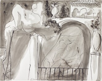 Brigitte Baer praised this early, dramatic work as Picasso’s “most successful print in the Suite Vollard and one of the most beautiful in the artist’s engraved work”. A modern interpretation of Rembrandt’s 1659 etching Jupiter and Antiope, this moonlit masterpiece is believed to symbolise Picasso’s evolving relationship with Marie-Thérèse Walter. Baer suggests that it “looks back nostalgically on their [1936] stay in Juan-les-Pins”, where the lovers became parents (Baer, 1983, p. 98). Picasso, the amorous faun, peers adoringly upon the mother of his daughter Maya, seeing her in a new light.