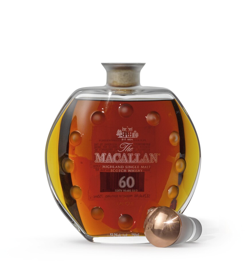 The Macallan In Lalique – Curiously Small Stills Decanter, 60 Years Old. Estimate $60,000–90,000.