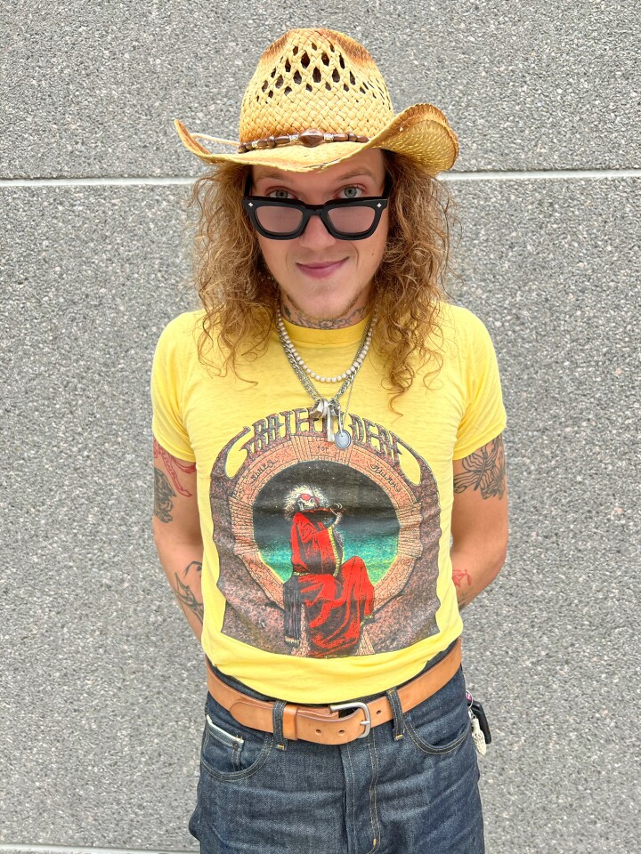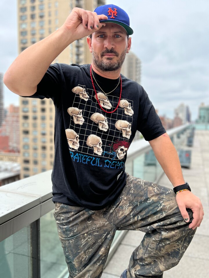 A rabbinical student turned journalist turned street photographer, Mordechai Rubinstein (a.k.a., @mistermort) has no shortage of personal style. The author of Dead Style (a visually rich, deep dive on the Grateful Dead’s influence on today’s fashion) chooses his favorite tees from our Grateful Dead Tee Shop.