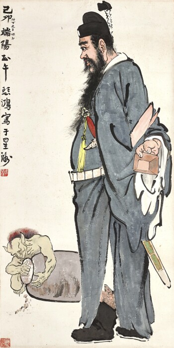 Zhang Daqian, Demon Queller . lot sold for 764,000 HKD. Zhong Kui is often featured at the fore of traditional paintings. According to folklore, painting the mythological deity at noon during the Dragon Boat Festival using cinnabar can ward off evil spirits and bring good fortune to town residences. As a repeated subject matter of Xu’s work, the creativity and skill showcased diverge from the exaggerated freehand brushwork of Ren Bonian or Wang Yiting’s Shanghainese style. By infusing elements of Chinese brush and ink into Western sketching foundations, the figure is anthropomorphized in terms of its body proportions, facial features, physique and even skin texture, keeping in line with ideas of realism.