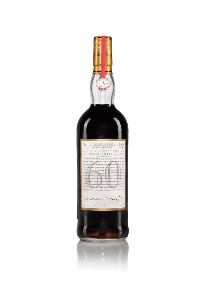在这40支于1986年装瓶的麦卡伦中,只有最多14瓶缀有标志性的珍稀系列酒标。其中一瓶于2019年在苏富比以破纪录价格拍出,另外两瓶无酒标的亦获拍出——其中一瓶的瓶身由爱尔兰艺术家迈克尔・狄龙亲手绘上麦卡伦的精神家园(Easter Elchies House)。此佳酿于2018年拍出,成为首瓶成交价超过1百万英镑的瓶装威士忌。