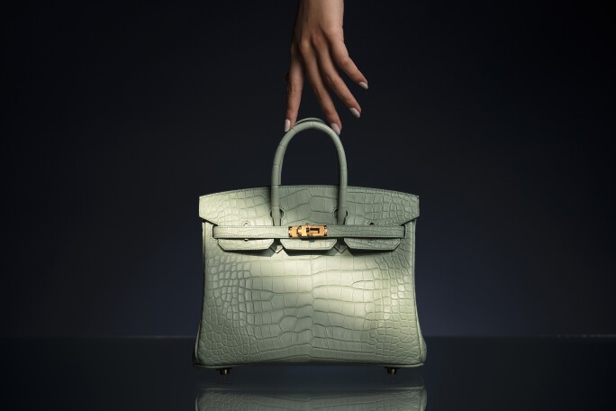 愛馬仕擅長發揮珍稀皮革的特色,以蜥蜴皮、鱷魚皮、鴕鳥皮和短吻鱷皮製成的柏金包數量稀少,價格高昂。比起鱷魚皮,短吻鱷皮的紋理不規則,鱗片更大而且沒有氣孔,手感也更柔軟。今次上拍的25公分湖水綠色柏金包非常適合日常使用,溫柔和煦的淺綠色淡雅端莊,令人愛不釋手。