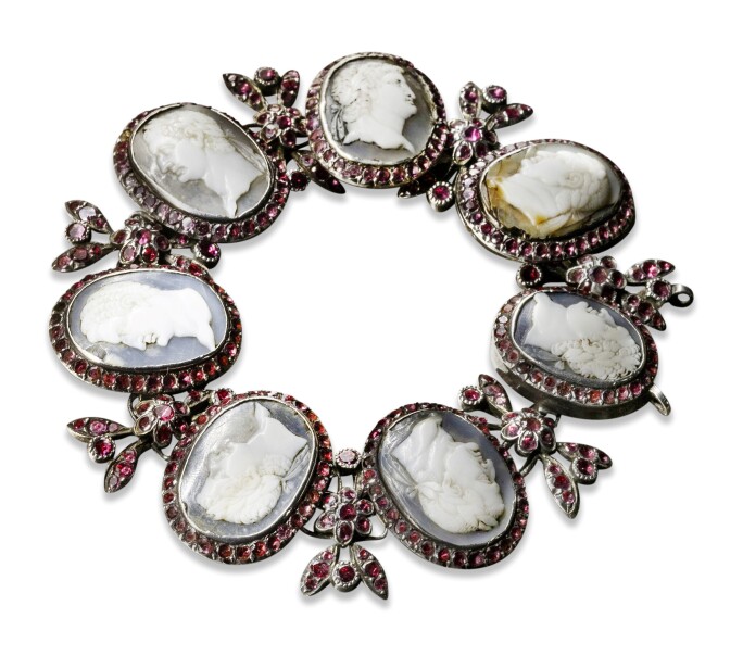 今次在巴黎展覽及拍賣會上面世的珠寶採用精美材料製成,鑲有明艷多彩的寶石,色彩對比分明,工藝卓絕,散發不朽美感,體現了品牌的獨特格調,足證Mellerio的悠長歷史與獨一無二的經營之道。本展蒐羅貴重非凡的Mellerio 定製首飾,包括一條十八世紀古董浮雕寶石配紅寶石手鏈,極有可能由讓・巴蒂斯特・梅勒里奧(Jean-Baptiste Mellerio,1765-1850年)在1780年售予瑪麗・安托瓦內特皇后。這條手鏈鑲有七顆浮雕寶石,繪羅馬皇帝肖像,可見安托瓦內特皇后最喜愛的兩項珠寶特色——浮雕寶石與紅寶石。