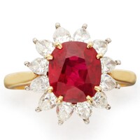 一枚 24.70 克拉紅寶石鑽石戒指於 2018 年以 86,392,500 港元成交。此紅寶石產自緬甸,天然未經加熱處理。瑞士珠寶研究院(SSEF)進一步證實,此寶石的色澤堪稱業界珍視的「鴿血紅」。其碩大尺寸與濃艷欲滴的紅色彰顯了緬甸天然紅寶石的稀世風采。紅寶石周圍環繞著 16 顆梨形鑽石,重量介於 1.07 至 1.73 克拉不等,均為 D 色至臻,無瑕至內部無瑕之極品。