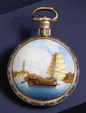 有趣的是,出口中國市場的鐘錶大多飾西方風景圖案,如邈遠的聳山峻嶺;許多琺瑯彩繪均啟發自歐洲著名油畫及雕刻圖案。拍品559上有一艘在黃埔古港下錨的中國帆船,前景可見著名的廣州琶洲塔,是一個極為獨特的作例。